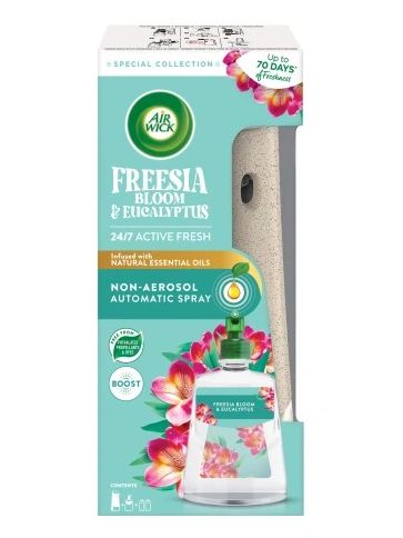 Automatický osviežovač vzduchu Air Wick Active Fresh Freesia Bloom & Eucalyptus uvoľňuje vôňu postupne a zanecháva priestory vášho domova neustále príjemne prevoňané. Zároveň neutralizuje nežiaduce vône a pachy. Vlastnosti: kvetinová vôňa vzdušná čistá vôňa jarná vôňa Zloženie: s obsahom esenciálnych olejov Použitie: Uchovávajte mimo dosahu detí a domácich zvierat. Pokiaľ sa náplň produktu stretne s kožou, okamžite ju umyte veľkým množstvom vody a mydla. Pri zasiahnutí očí niekoľko minút vyplachujte vodou. Postupujte podľa priloženého návodu.