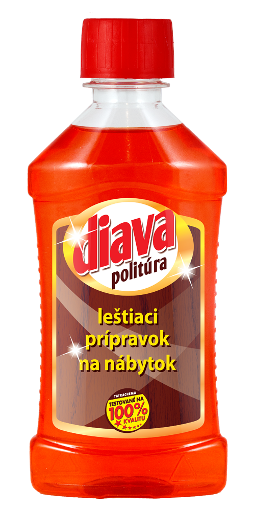 Obsahuje: benzín /ropný/, hydrogenačne odsírený, ťažký; petrolej /ropný/, hydrogenačne odsírený, petrolej. Návod na použitie: Diavu politúru naniesť na nábytok a po uschnutí preleštiť flanelom. Upozornenie: Horľavá kvapalina a pary. Môže byť smrteľný po požití a vniknutí do dýchacích ciest. Dráždi kožu. Môže spôsobiť ospalosť alebo závraty. Toxický pre vodné organizmy, s dlhodobými účinkami. Bezpečnostné upozornenie: Uchovávajte mimo dosahu detí. Uchovávajte mimo dosahu tepla, horúcich povrchov, iskier, otvoreného ohňa a iných zdrojov zapálenia. Nefajčite. Nevdychujte pary. Po manipulácii starostlivo umyte ruky vodou a mydlom. Používajte iba na voľnom priestranstve alebo v dobre vetranom priestore. Noste ochranné okuliare. Prvá pomoc: Po požití: nevyvolávajte zvracanie. Okamžite volajte toxikologické informačné centrum alebo lekára. Pri kontakte s pokožkou /alebo vlasmi/: Všetky kontaminované časti odevu okamžite vyzlečte. Pokožku opláchnite vodou/sprchou. Po vdýchnutí: presuňte osobu na čerstvý vzduch a umožnite jej pohodlne dýchať. Okamžite volajte Toxikologické informačné centrum alebo lekára. Po zasiahnutí očí: Niekoľko minút ich opatrne vyplachujte vodou. Ak používate kontaktné šošovky a ak je to možné, odstráňte ich. Pokračujte vo vyplachovaní. Pokyny na zneškodnenie: Zneškodnite obsah a obal v mieste zberu nebezpečného alebo špeciálneho odpadu. Zloženie > 30% alifatické uhľovodíky, parfum: Limonene, farbivo.