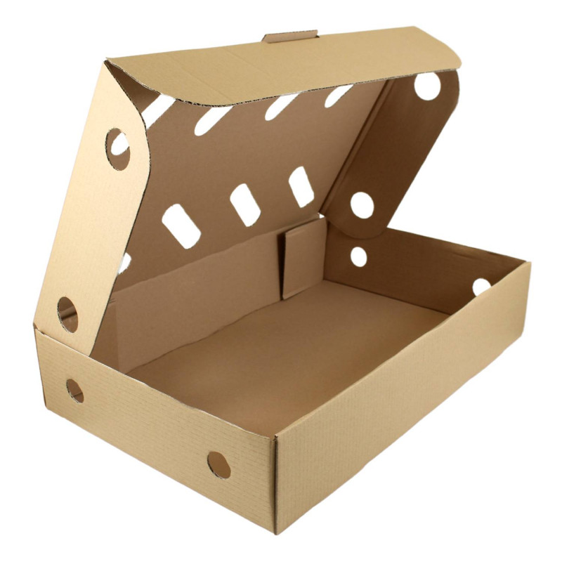 Kartónové krabice s klopovým vekom a vetracími otvormi z trojvrstvovej vlnitej lepenky patria v súčasnosti k najpoužívanejším obalom. Tento obal je ekologický a plne recyklovaný. Sú vhodné na skladovanie a taktiež prepravu najrôznejších materiálov a tovarov, hlavne sa hodia pre mäsiarský a potravinársky priemysel na uskladnenie mrazeného mäsa. Krabica s klopovým vekom je typ konštrukcie ktorá zvyšuje celkovú pevnosť krabíc a pomáha chrániť zabalený tovar pred otrasmi a inými vonkajšími vplyvmi, má po bokoch a na veku vetracie otvory pre cirkuláciu vzduchu. Krabice v rozloženej forme sa ľahko skladujú. Manipulácia s krabicami je veľmi jednoduchá a zložiť ju zvládne naozaj každý. Material: 3VVL. hnedý Systém uzatvárania: klopové veko Rozmer dlžka: 570mm Rozmer šírka: 360mm Rrozmer výška: 150mm Vnútorný rozmer v mm: 560x350x140 Hmotnosť: 322g Cena je za 1ks