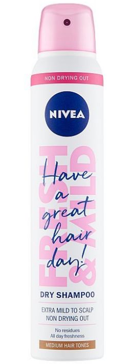 Nivea Fresh & Mild Suchý Šampón 200ml, špeciálne navrhnutý pre stredné tóny vlasov. Táto jemná aerosólová formula absorbuje prebytočný maz a nečistoty bez zaťaženia, zatiaľ čo jemné pigmenty sú prispôsobené strednej farbe vlasov, aby sa zabránilo výraznému efektu prášku.