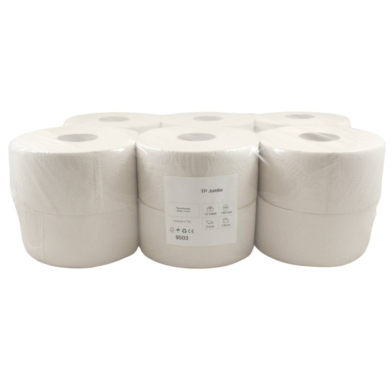 Toaletný papier JUMBO Ø 19 cm, 135 m 2vrst.70%belosť (12ks) Toaletný papier recyklovaný   Ø​ 19 cm, 2 vrstvový, 70% belosť, 135 m,    Cena za balenie 12 ks